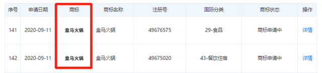 天眼查App顯示,阿里巴巴集團控股有限公司于9月11日申請了多個(gè)“盒馬火鍋”的商標,類(lèi)別包括食品、餐飲住宿、廣告銷(xiāo)售、飼料種籽等。